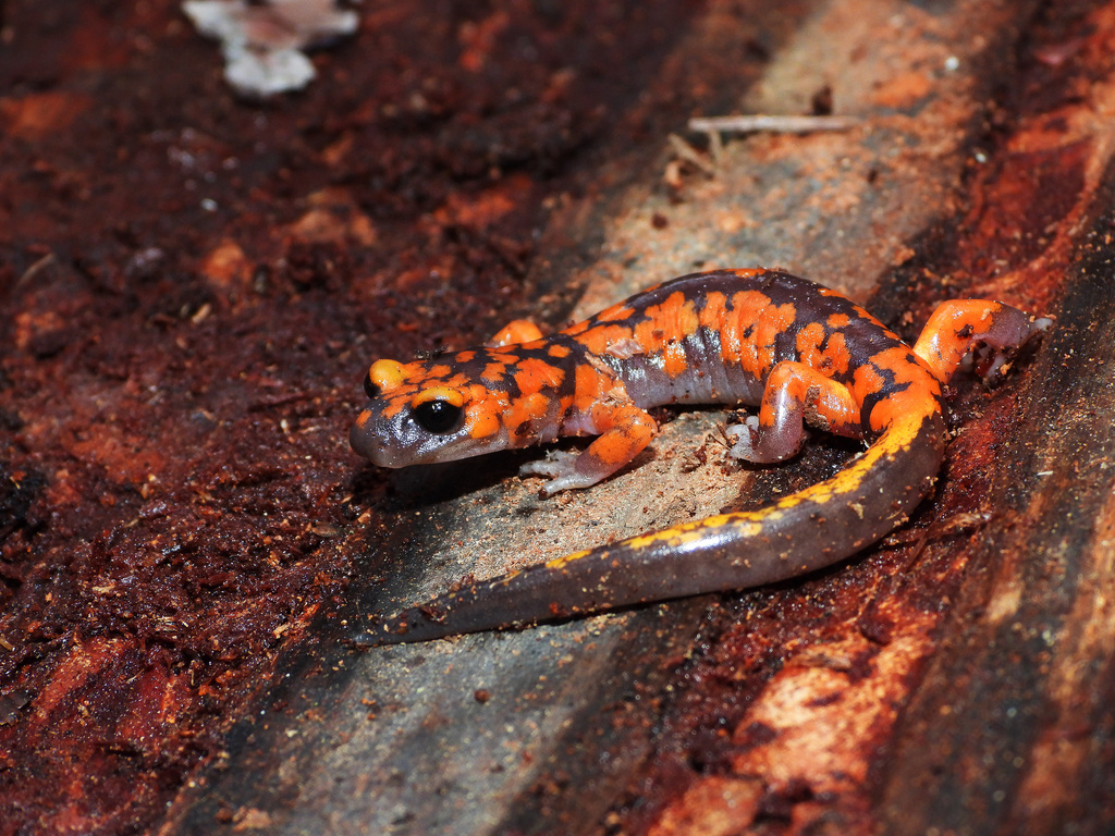 Ensatina eschscholtzii (commonly known by its genus name, Ensatina) is a complex of plethodontid (lungless) salamanders found in coniferous forests, oak woodland and chaparral from British Columbia, through Washington, Oregon, across California (where all seven subspecies variations are located), all the way down to Baja California in Mexico. The genus Ensatina originated approximately 21.5 million years ago.