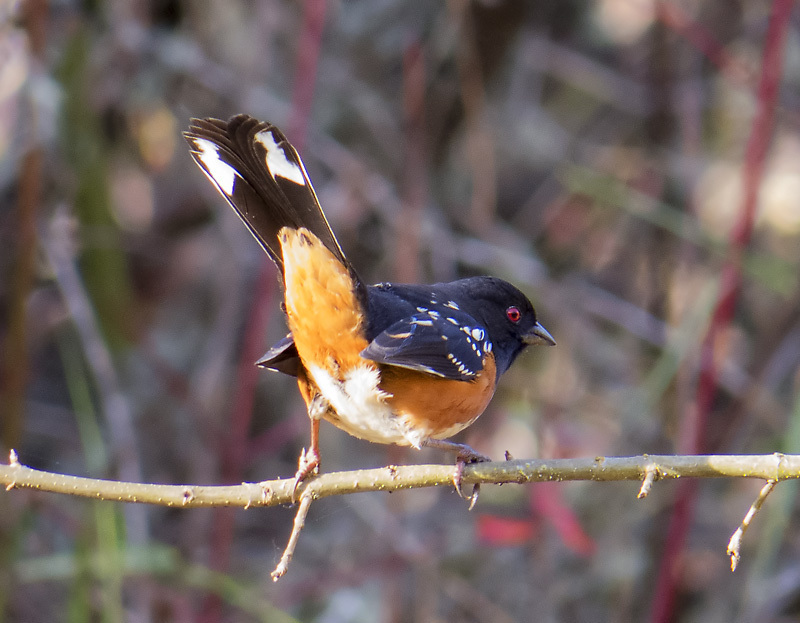 The spotted towhee (Pipilo maculatus) is a large New World sparrow. The taxonomy of the towhees has been debated in recent decades, and until 1995 this bird and the eastern towhee were considered a single species, the Rufous-sided Towhee. An archaic name for the spotted towhee is the Oregon towhee (Pipilo maculatus oregonus).