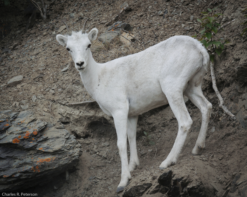 The thinhorn sheep (Ovis dalli) is a species of sheep native to northwestern North America, ranging from white to slate brown in colour and having curved, yellowish-brown horns. The two subspecies are the nominate Dall sheep or Dall's sheep and the more southern subspecies, Stone sheep (also spelled Stone's sheep) (O. d. stonei), which is a slate brown with some white patches on the rump and inside the hind legs.