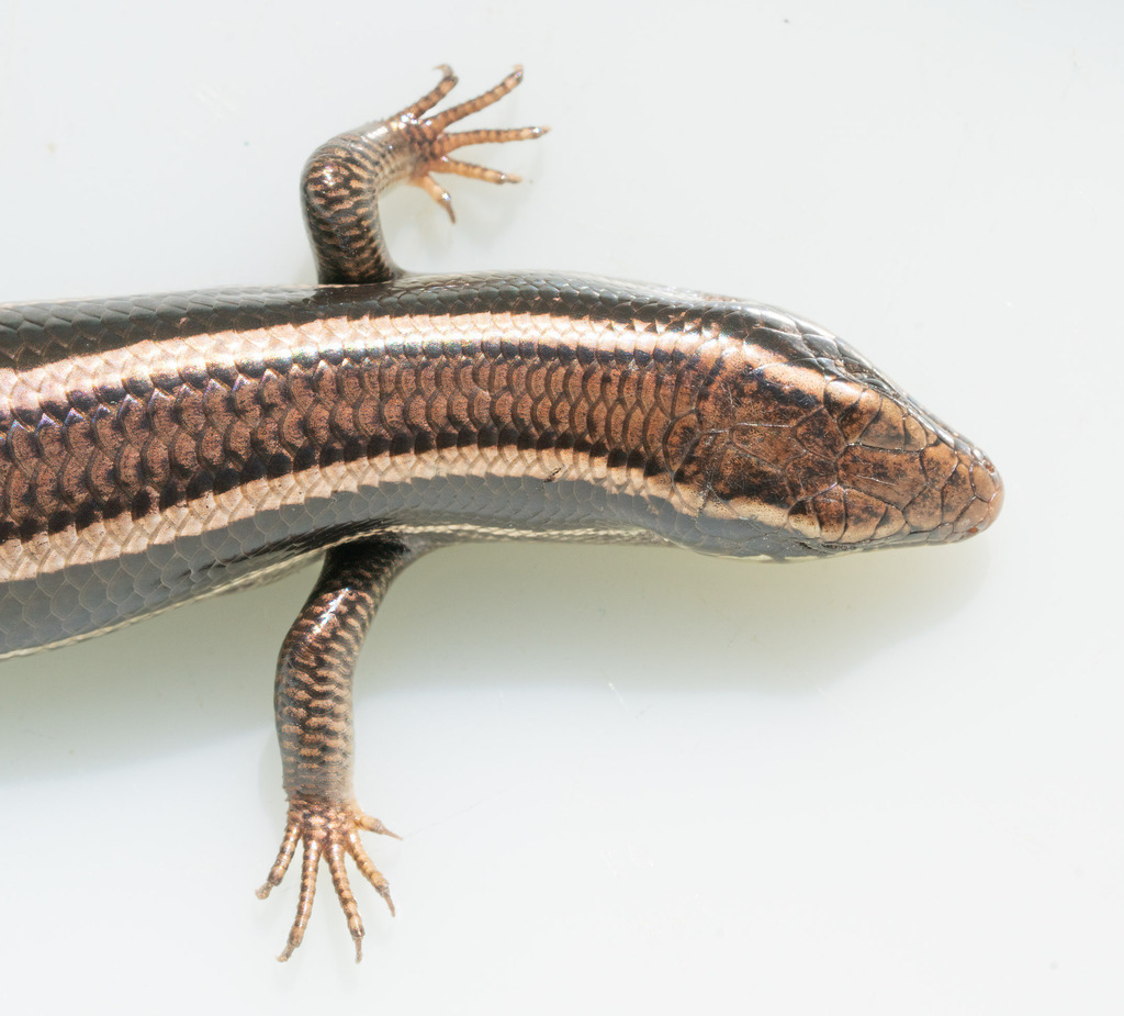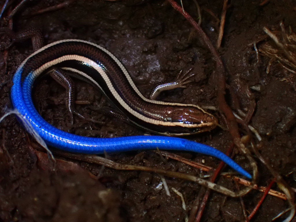 The western skink (Plestiodon skiltonianus) is a species of small, smooth-scaled lizard with relatively small limbs. It measures about 100 to 210 mm (about 4 to 8.25 inches) in total length (body + tail). It is one of five species of lizards in Canada. They spend much of their day basking in the sun. Their diet ranges widely, including spiders and beetles. Western skinks will bite if grasped and will flee if they feel threatened. It is...